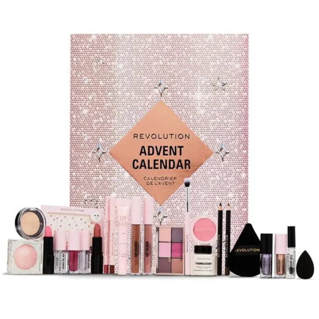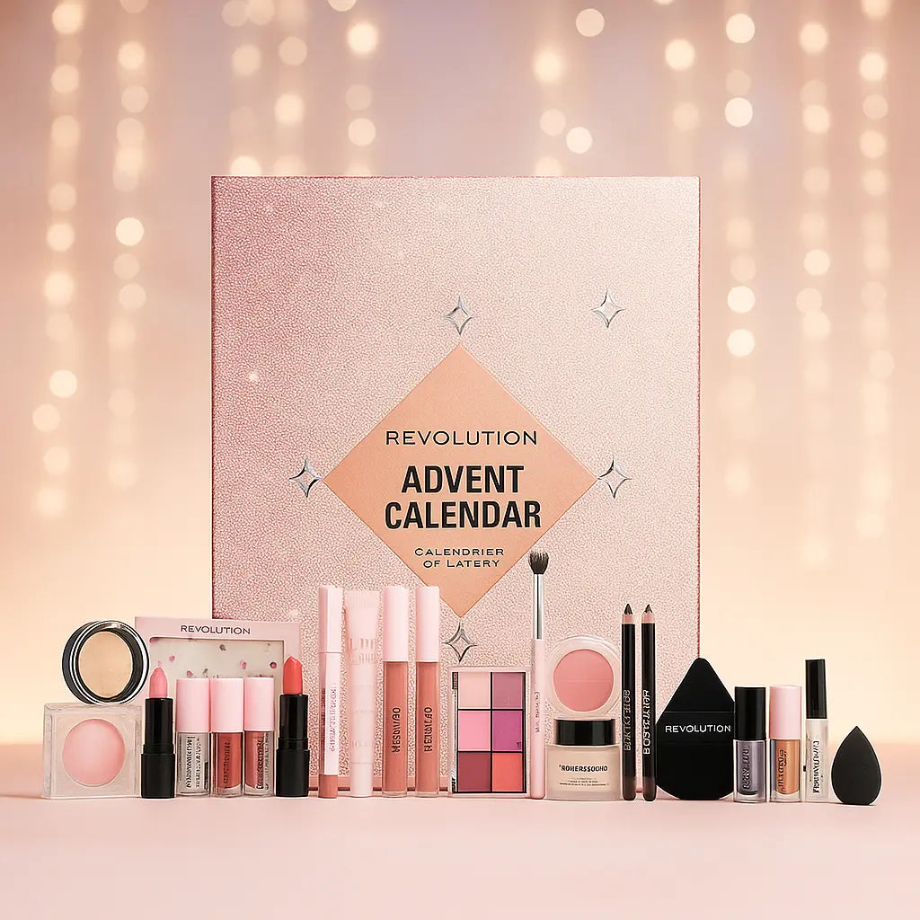 Grand coffret de l’Avent contenant 24 surprises maquillage & accessoires en édition limitée (mini & full-size) : gloss/lipsticks, palettes yeux, highlighter, blush, poudre libre, primer, mascara, liners yeux/sourcils, éponges/brush, etc. Idéal pour (se) faire plaisir tout le mois de décembre.