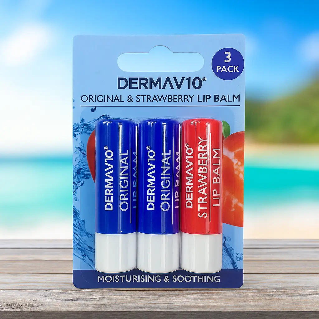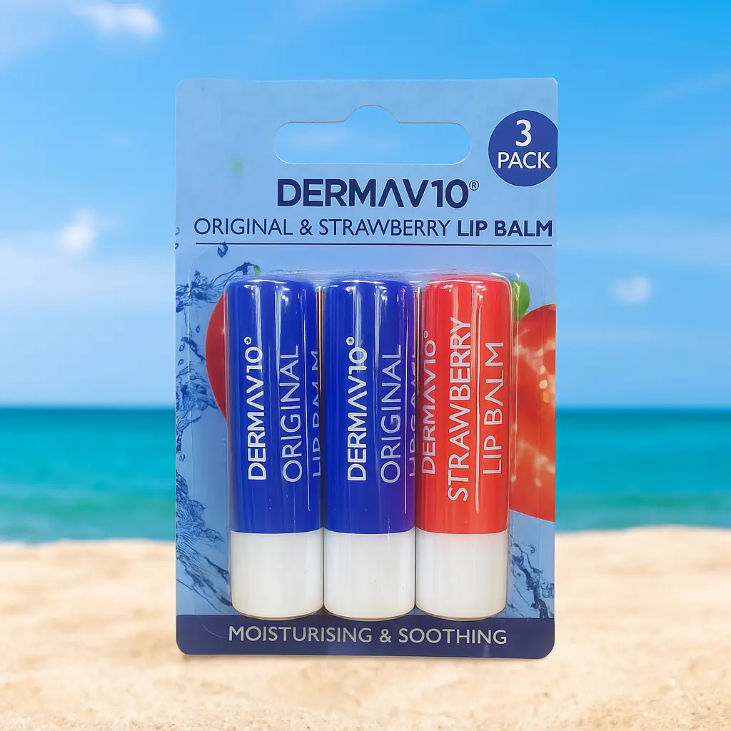 💄 DermaV10 – Lot de 3 Baumes à Lèvres Original & Fraise (Strawberry)