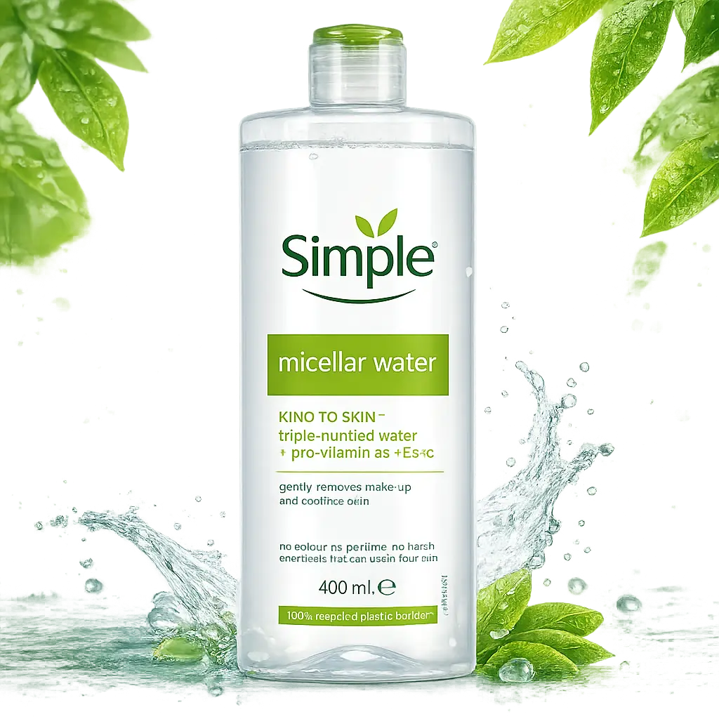 Simple Micellar Water 400ml est une eau micellaire douce spécialement formulée pour les peaux sensibles. Grâce à sa technologie triple purifiée et enrichie en Pro-Vitamine B5 + Vitamine B3 + Vitamine C, elle élimine efficacement le maquillage, les impuretés et l’excès de sébum tout en respectant l’équilibre naturel de la peau.