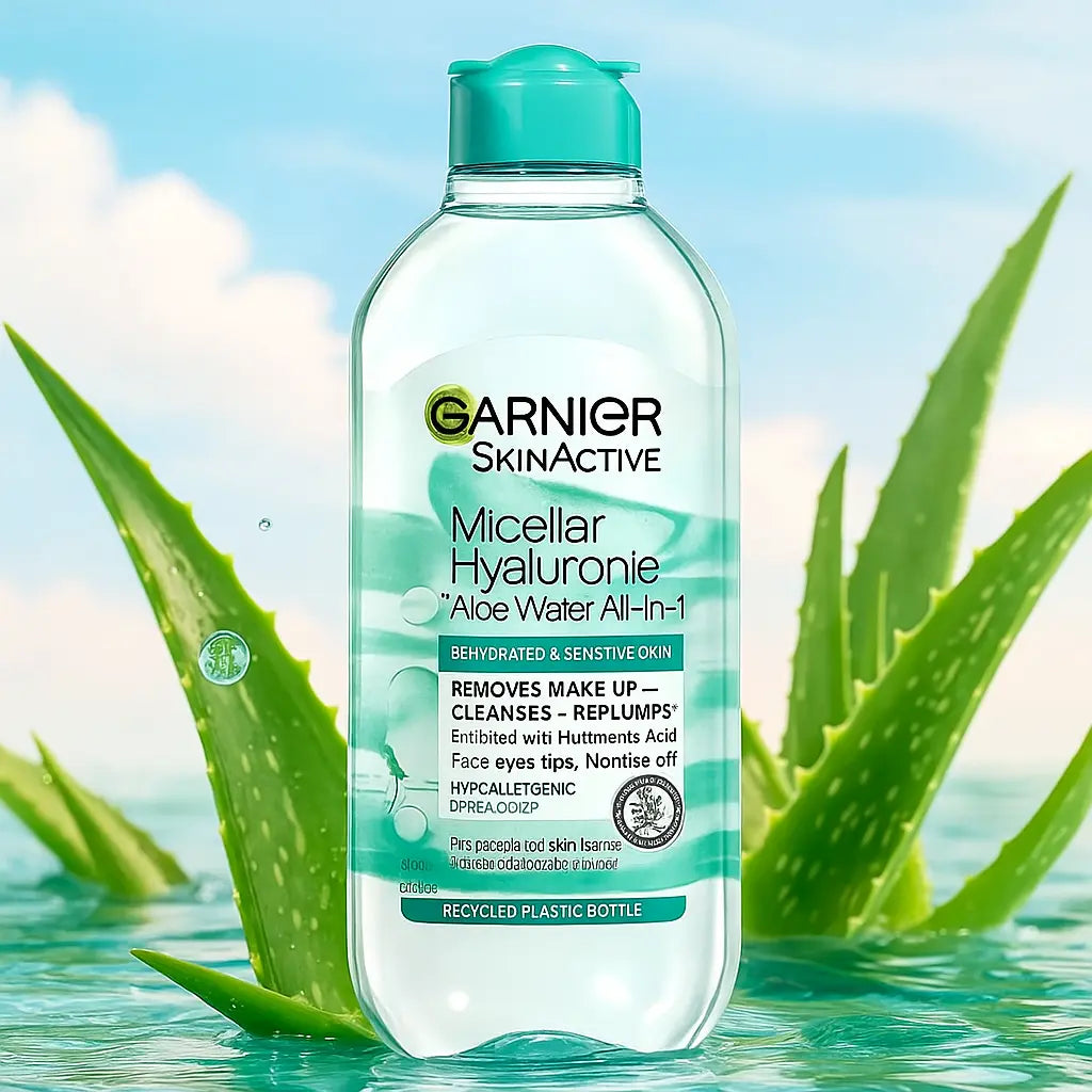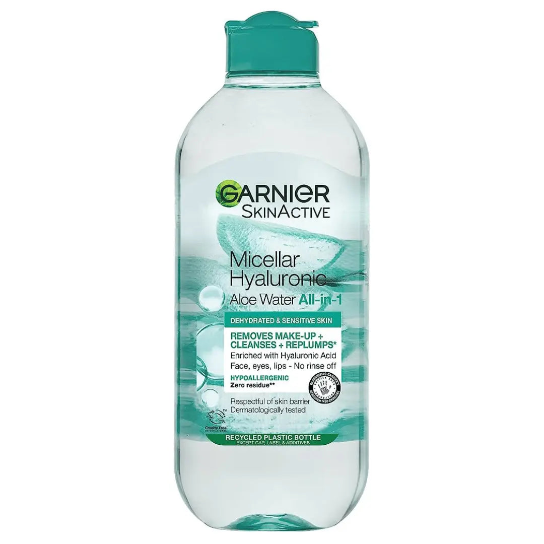 Garnier SkinActive – Eau Micellaire Hyaluronique & Aloe – 400 ml. Lotion micellaire tout-en-1 qui démaquille, nettoie et repulpe en un seul geste. Enrichie en acide hyaluronique et aloe vera pour les peaux déshydratées & sensibles. Sans rinçage. Visage, yeux, lèvres.