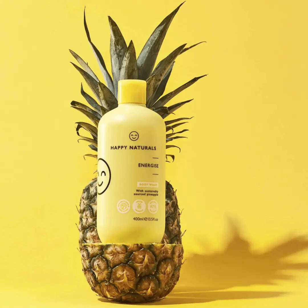 Êtes-vous prêt à vous réveiller et à briller avec Happy Naturals ? Notre nettoyant pour le corps énergisant est rempli d'ingrédients naturels et de parfums frais et fruités pour vous aider à vous sentir plus revitalisé et stimuler le bonheur. Infusé d'extrait d'ananas et d'açaï durable, ce gel douche énergisant ravivera immédiatement votre journée. Utilisez-le avec notre gel corporel énergisant Happy Naturals pour une peau incroyablement douce et lisse. Obtenez votre dose quotidienne de positivité avec Happy Naturals ! Fabriqué avec 97% d'ingrédients naturels et vég