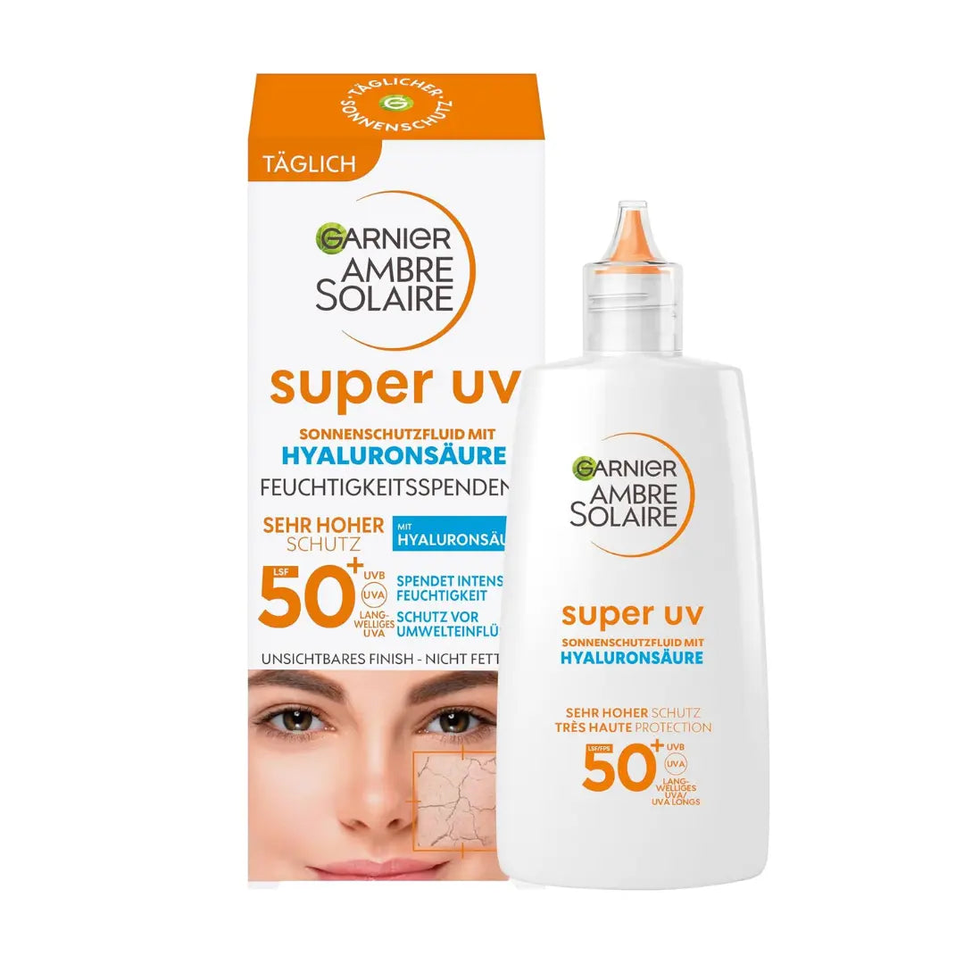 Garnier Ambre Solaire – Super UV Fluide Hydratant à l’Acide Hyaluronique SPF50+ (visage)